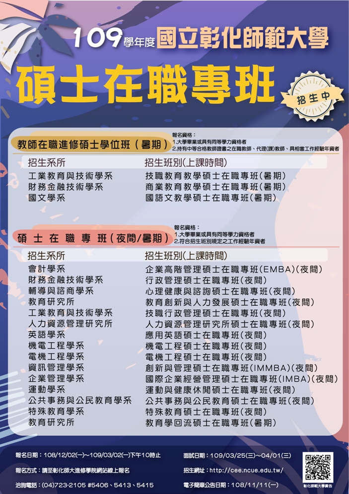 一、109學年度招生類別分為「教師在職進修碩士在職專班」及 「碩士在職專班」,招生簡章請至本校進修學院首頁下載 (http://cee.ncue.edu.tw/)。