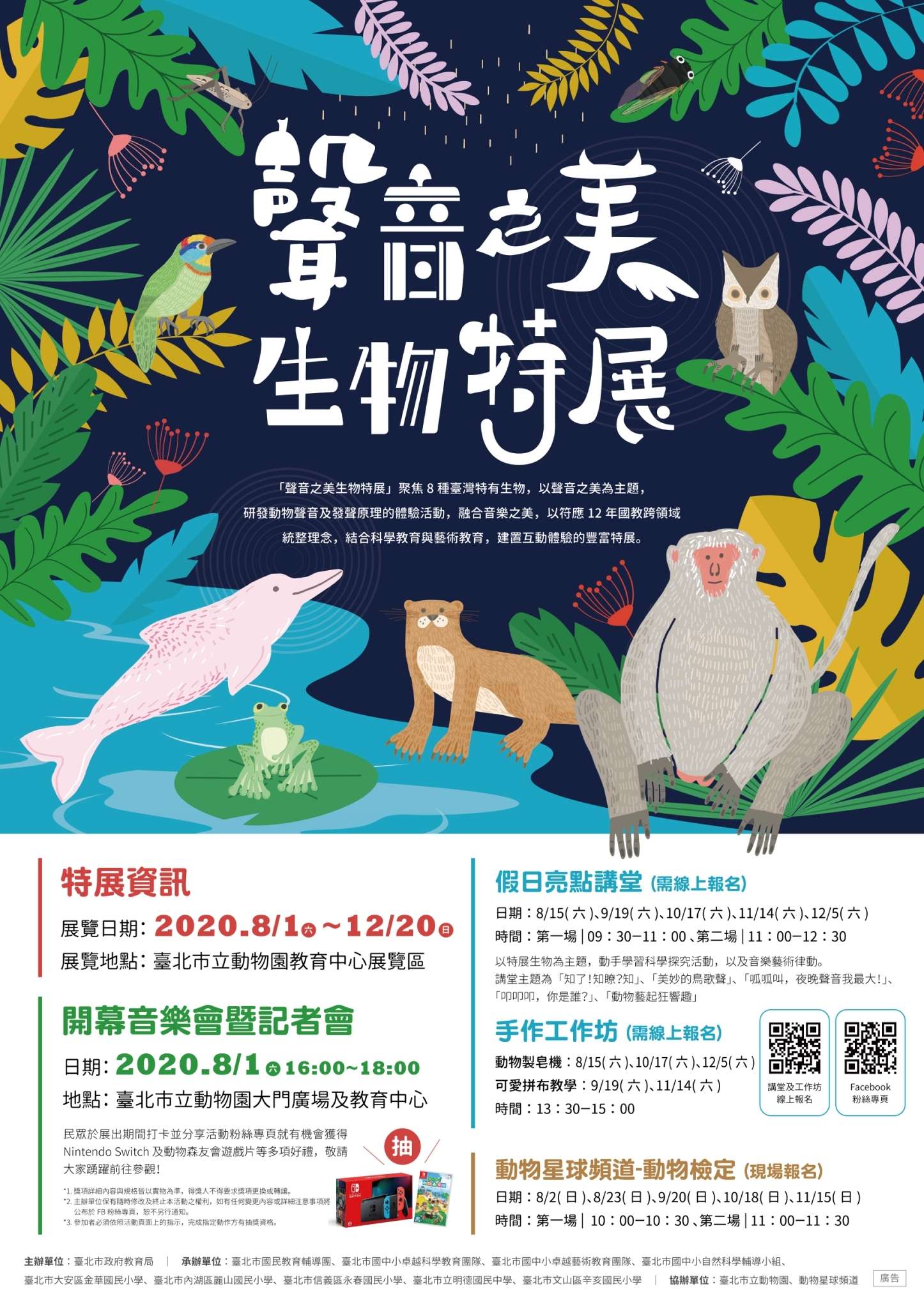 二、旨案自109年8月1日(星期六)至109年12月20日(星期 日)假臺北市立動物園教育中心展覽區舉辦「聲音之美生 物特展」,聚焦8種臺灣特有種生物,以聲音之美為主題, 研發動物聲音及發聲原理的體驗活動,融合音樂之美,以 符應12年國教跨領域統整理念,建置互動體驗的豐富特 展。
