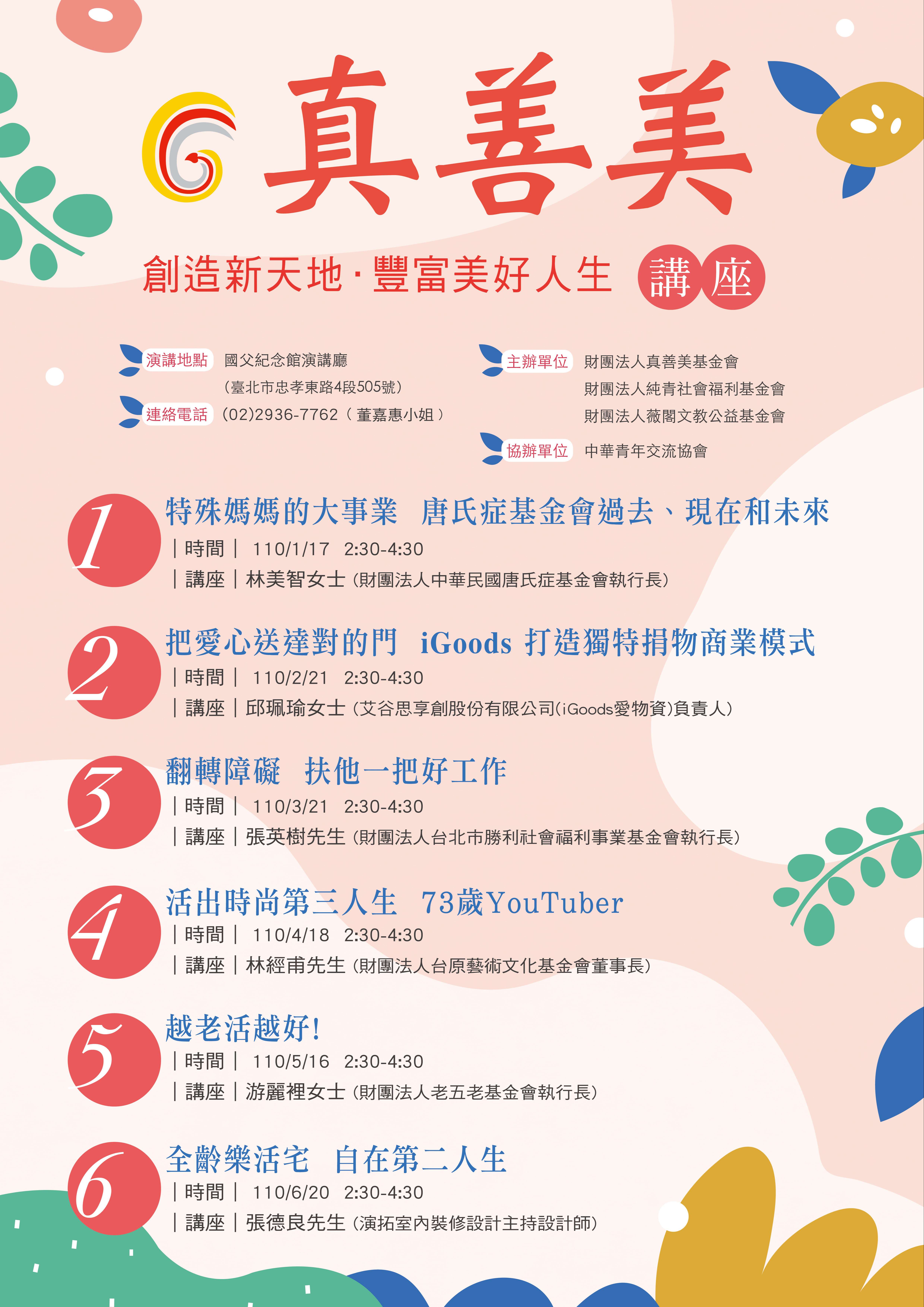 一、財團法人真善美基金會與國立國父紀念館、財團法人純青社會福利基金會、 財團法人薇閣文教公益基金會共同舉辦「110年度真善美講座」,講座主題為「創造新天地 豐富美好人生」,歡迎有興趣者踴躍參加。