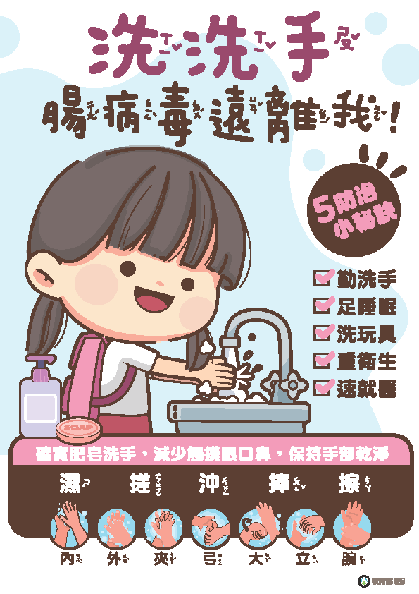 學校及幼兒園為腸病毒易感族群之聚集場所,病毒極易透 過學童的密切交流,傳播至家庭及社區,請提醒學童~~
