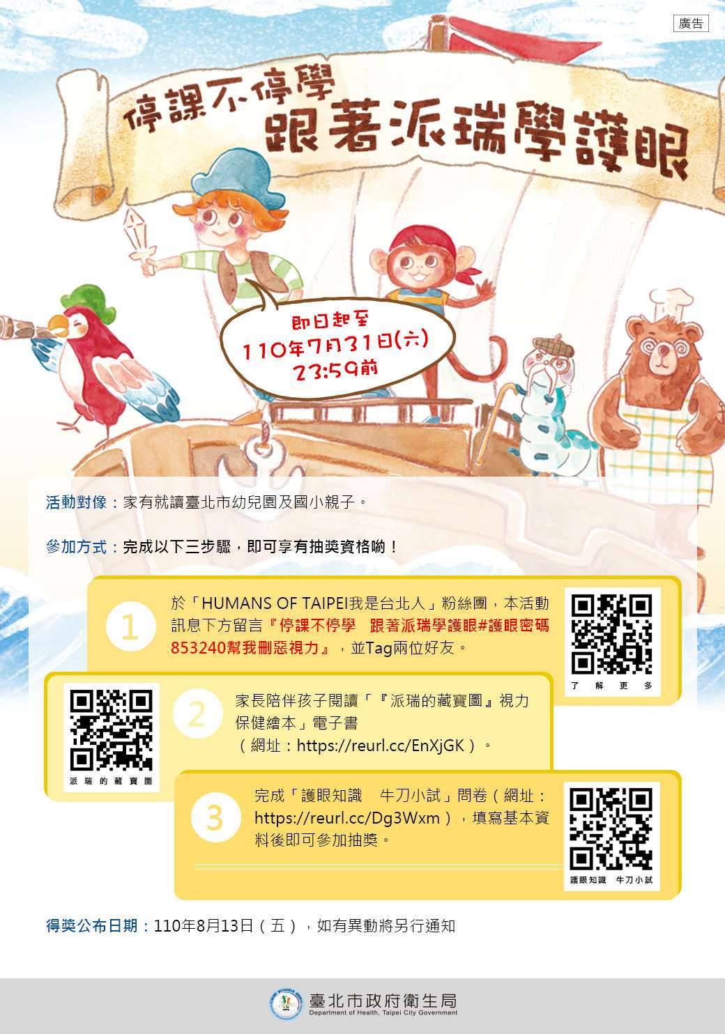 (三)參加方式:至臉書「Humans of Taipei 我是台北人」粉絲專頁活動頁面,依步驟及範例留言、完成閱讀「派瑞的藏寶圖視力保健繪本」電子書及答題後,即可參加抽獎。