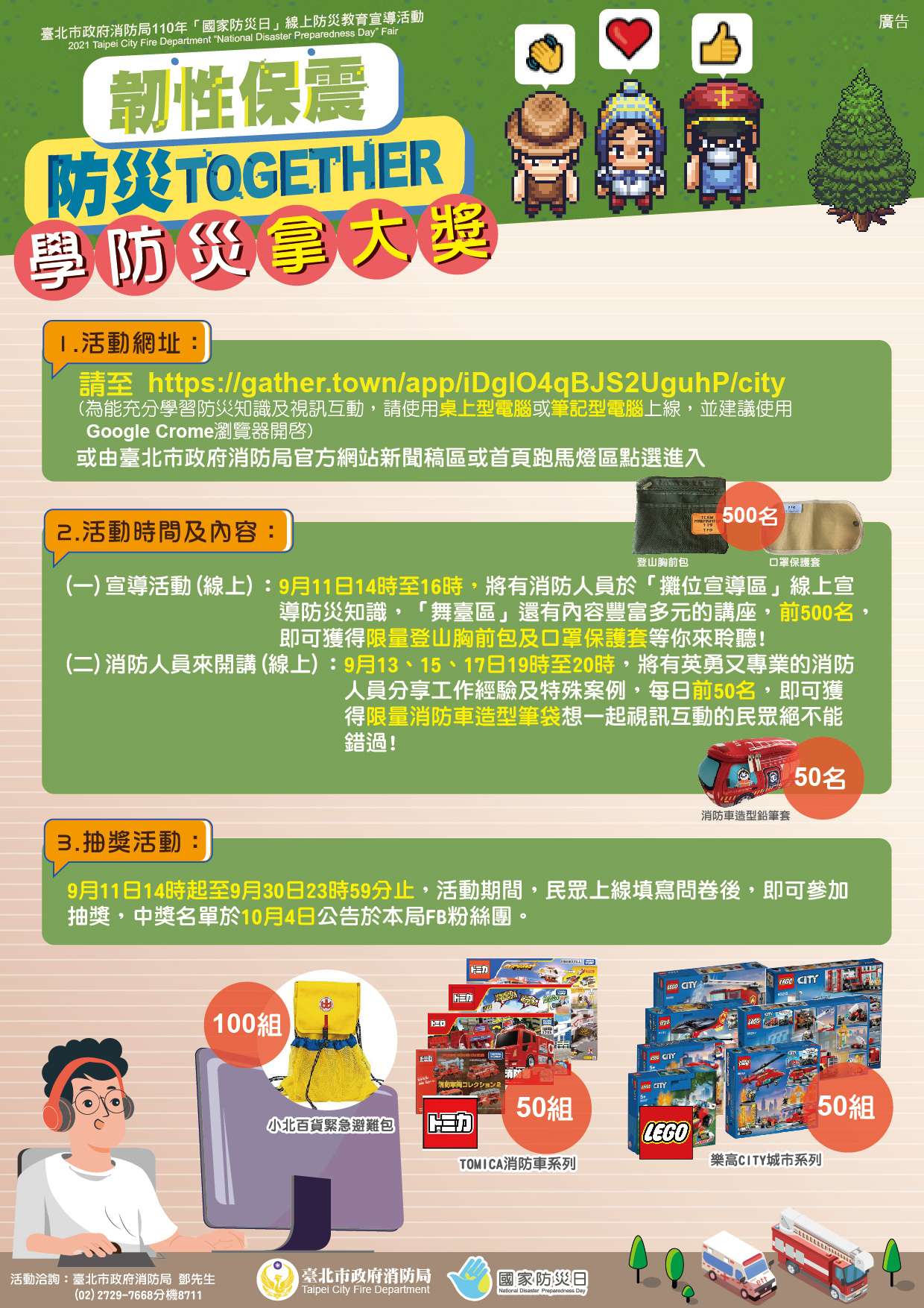 (三)線上宣導活動:於110年9月11日14時至16時,消防人員將於「攤位宣導區」上線,並透過視訊方式宣導防災知