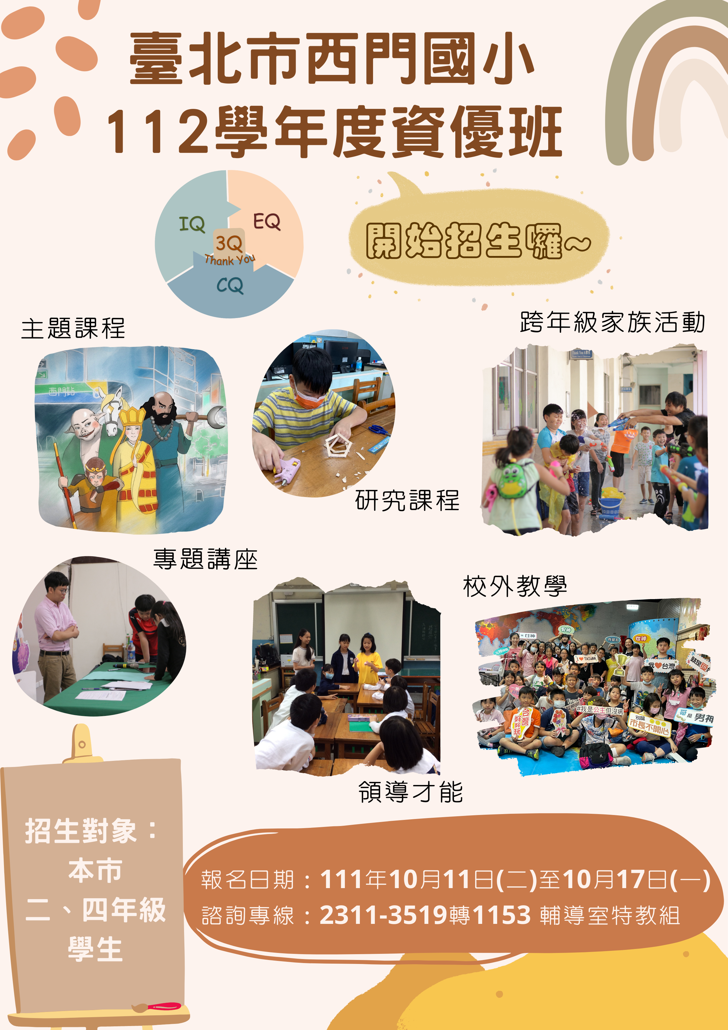 一、西門國小訂於111年9月30日晚上6點20分至7點30分辦理112學年度一般智能資賦優異鑑定安置說明會。