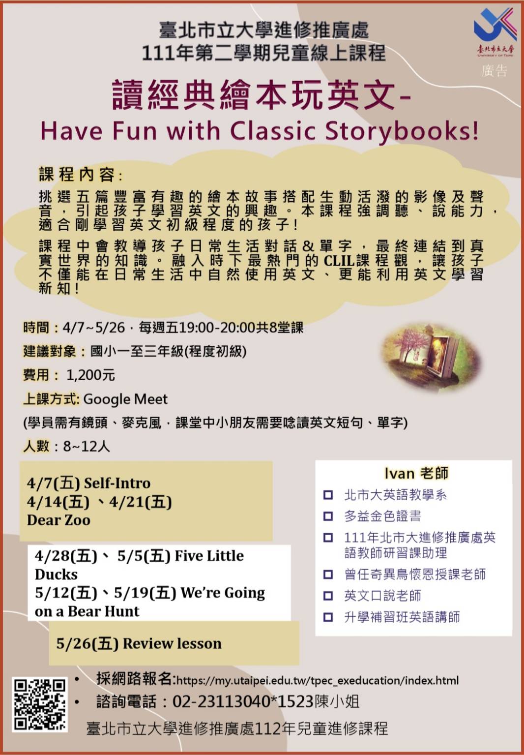 主旨:該校進修推廣處於112年4月開辦兒童線上課程「讀經典繪 本玩英文」