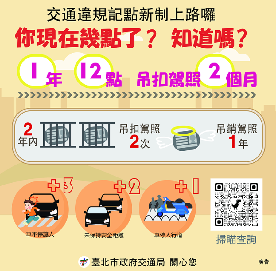 因應自112年6月30日起實施交通違規記點新制,需加強宣導家長正確用路觀念及知識,請貴單位將相關資料刊登於