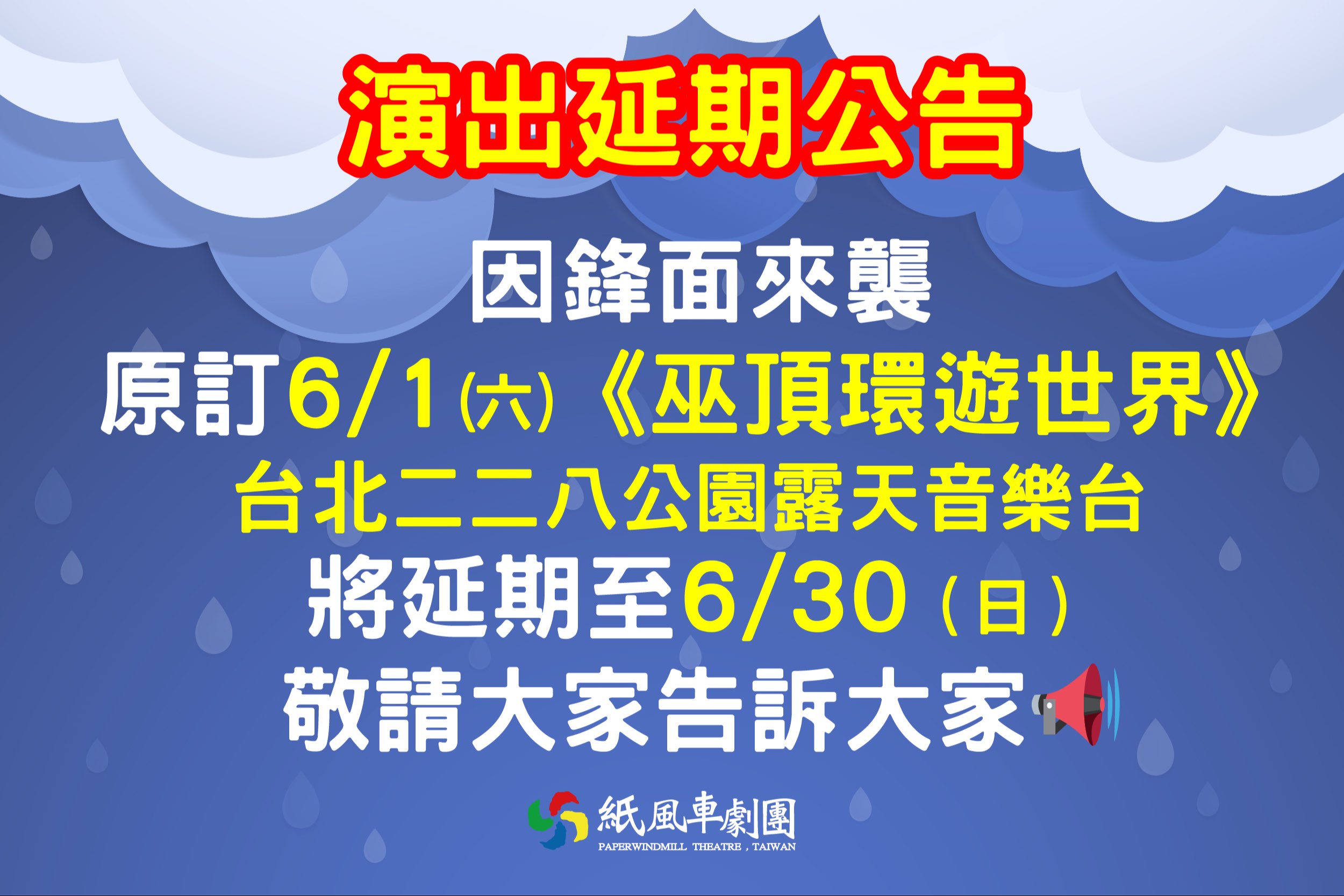 因本週末有大雨特報,故原訂6/1(六)在二二八和平公園露天音樂台《巫頂環遊世界》將延期至6/30(日)17:00,敬請老師協助發佈訊息,以免小朋友跑錯,謝謝!