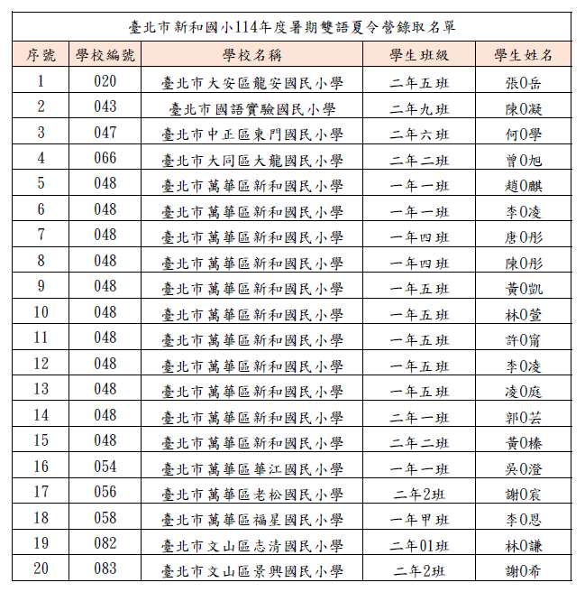 本校114年度暑期雙語夏令營錄取名單如下相關紙本通知將於4/30擲交各校教務處協助轉發請於5/9(五)前回填線上確認表單、以利後續並請詳閱通知單上備註事項感謝您的配合