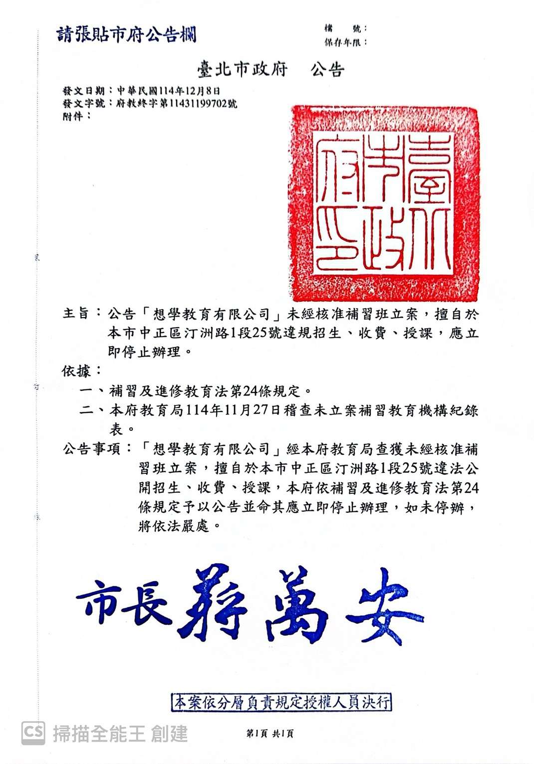 有關「想學教育基地」於本市中正區汀洲路1段25號經營未立案補習班一案,業經市府114年12月8日府教終字第 11431199702號公告,請協助公告並轉知貴校學生及家長 知悉,請查照。