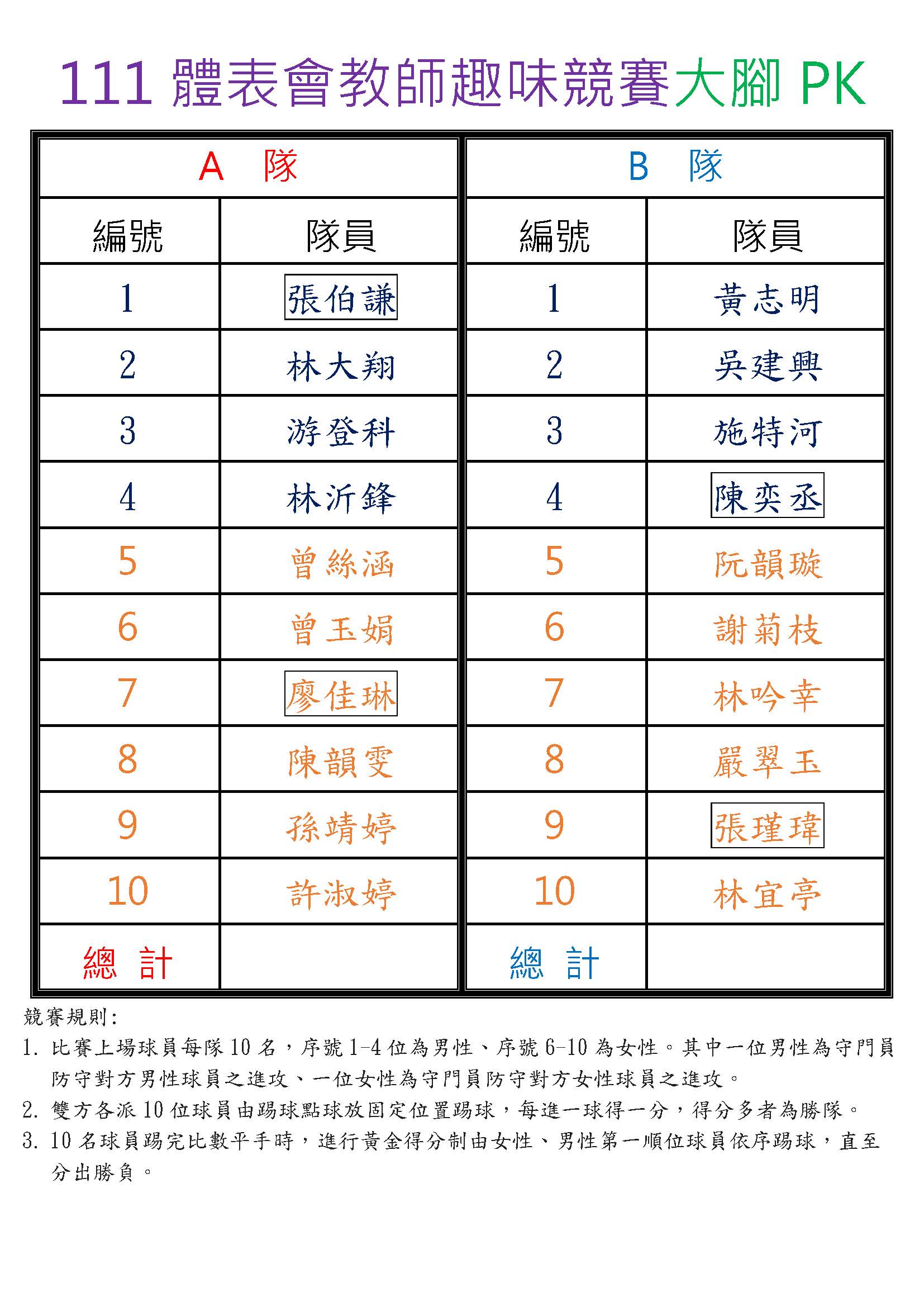 恭喜本校角力隊參加111年全國總統盃角力錦標賽榮獲一金一銅! 603 葉子睿勇奪第四量級(42KG以下)金牌 601 葉子愷勇奪第四量級(42KG以下)銅牌 ★ 111學年度體育表演會相關事項 1、感謝各位老師上週一的協助,各學年與表演節目都算很順利的完成,謝謝各位老師在有限的時間還能有這麼棒的演出,學務處感謝各位老師的協助與幫忙! 2、本週二我們進行正式彩排,彩排視同正式演出,請各學年有要上道具的,請以正式演出的規格為基準,彩排時間表請見以下圖片說明,現場請聽怡秀老師廣播在校門口第四預備區集合。 3、學務處這邊也要拜託老師,若班上有跨項目演出的學生(尤其一年級),麻煩老師協助指導學生在什麼時間點到班上去報到,學務處這邊也盡可能的安排好,以免到時找不到學生! 4、各學年要核銷的項目,請盡快交給體育組處理,目前二、三年級已經完成,其餘學年請於本週三前交給我,讓我盡快為大家請款! 5、本週六正式演出,請老師穿著今年新發的橘色上衣,而教師組的大腳PK,名單也公布了,老師若有時間,也歡迎到體育館練習,目前暫訂週二下午的17:30可以到體育館練習!(運動前會有暖身活動,相關影片會盡快公告給校長、主任及各位老師練習唷) 6、週二彩排請1~3年級8:50至現場觀眾區就位,週六正式演出請4、6年級8:50至現場觀眾區就位,5年級同學則是彩排、正式皆是8:50到場後方就位完畢! 7、再度提醒老師們,在移動到活動中心前,務必進行清潔消毒的工作,演出完畢回到學校內,也再麻煩老師再度清消,學務處感謝各位老師的幫忙!