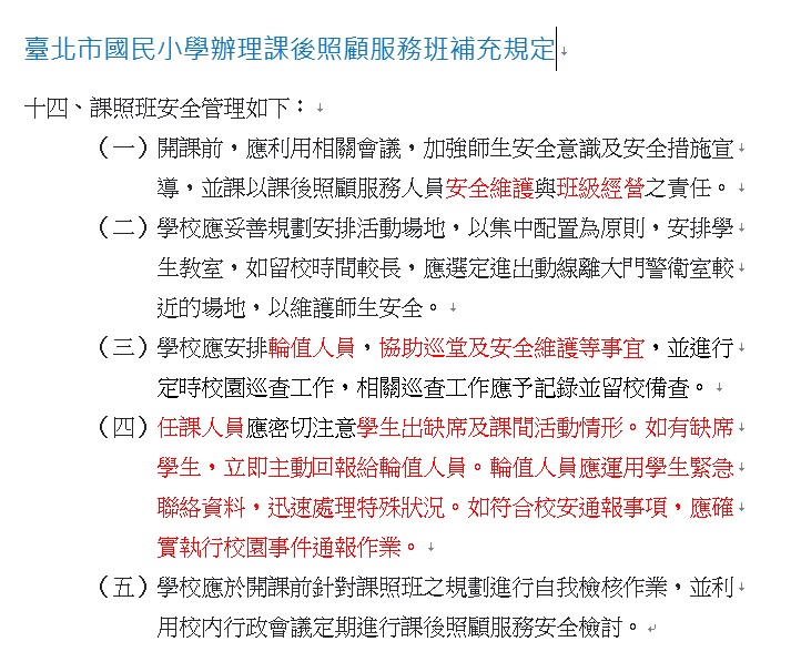 一.【防治校園性侵害、性騷擾或性霸凌事件性別事件多元通報管道宣導單張】 依據教育局來文製發,請級任老師協助貼聯絡簿通知家長並在班級跟學生加強宣導 校內通報流程-跟老師報告,老師接獲報告做初步辨識和判斷後通報學務處。 二.學業輔導學生推薦 1.實施時間:112年10/2~113年1/4每周一和周四。 訂正作業的學生。 3.推薦對象須先經家長同意(依據學生輔導法規定)。 4.無論是否推薦請9/22(五)前將資料裝入保密信封送交輔導室。 三.課後照顧班事務,請班級老師和課後班老師配合 及時掌握學生動向和安全。 2.確定版的全學期點名表已發給各課後班老師,請老師妥善保管與運用。 3.本周除轉學生不再接受報名,要退班請家長填退班申請單送輔導組辦理。 4.課後照顧班應本多元活潑之原則規劃,內容以家庭作業寫作為優先、再 安排團康與體能活動及生活照顧等。 5.【安全第一】請務必上課10分鐘內完成點名,上週行政輪值接獲家長電話 有學生回到家被安親班老師帶走,課後班老師不知道的狀況,希望老師要特別留意學生安全,以免違反規定。相關規定請參閱: