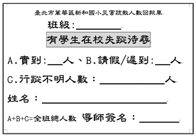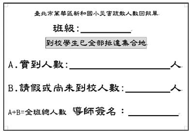 d.校舍巡檢+緊急滅火—安全防護組回報起火並進行滅火 e.人數統計回報--各班抵達集結點後、導師點名並填寫通報單(紅或綠),交
