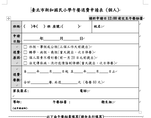 營養午餐 1.退餐申請流程,請老師協助注意。 2.申請表可在校網、公資夾下載或學務處拿取