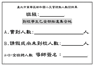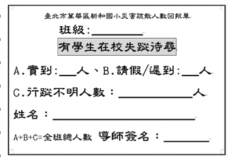 d.校舍巡檢+緊急滅火—安全防護組回報起火並進行滅火 e.人數統計回報--有學生失蹤待尋填紅單,若全員到齊則填綠單。 f.搜尋失蹤學生及傷患救助—經導師清點通報後,由搶救組、緊急救護組合作進行。 g.災情回報 h.演練結束返回教室 過程全程會透過對講機及廣播讓同學聆聽並參與演練 演練當日若有請假或其他狀況,請務必通知自己所屬組別組長,以便人力調派支援。感謝各位同仁 *以上相關電子檔放置公資夾050-3防震防災專區/112全國防災日中參考下載 二、配合二期校舍工程、學務處規劃後門自9/25(一)起開放上放學進出,路隊與導護工作同步調整,導護工作於移交時說明,路隊調整請參閱紙本: