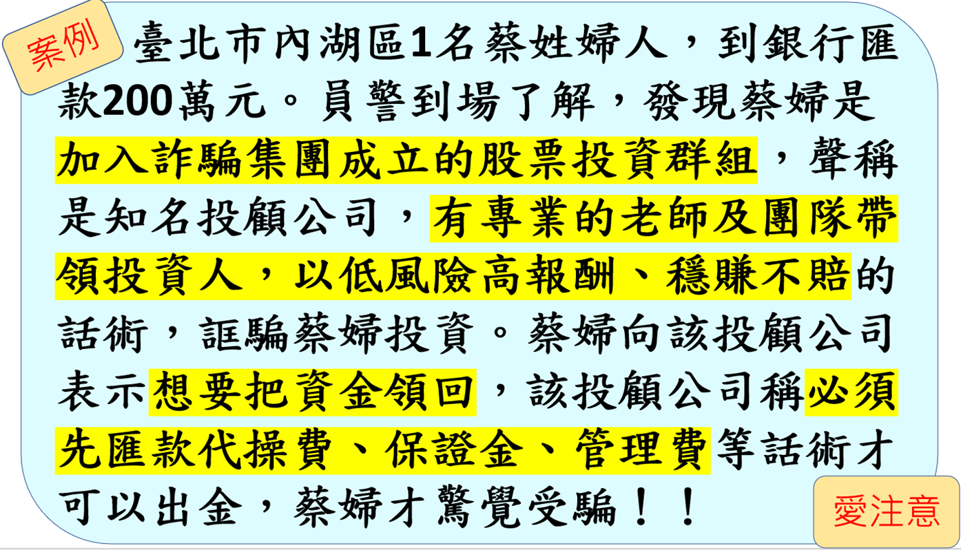 (一)網路購物詐騙412件。(二)假投資詐騙404件。(三)假買家騙賣家261件。