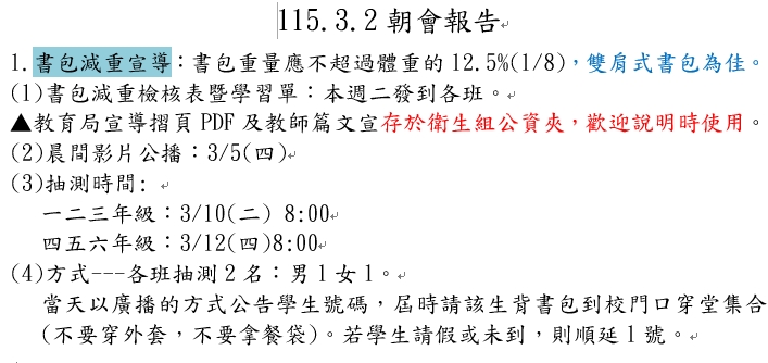 生教組 | 1.依教育局「防制學生藥物濫用計畫」、「特定人員尿液篩檢及輔導作業實施計畫」進行每學期開學之特定人員清查與提列,說明如ppt。 2.依教育局來文,為增進學生與教師對防災知識的理解,提升防洪減災知識普及率,故建置旨揭測驗平台,進行學習成果認證。 如附件(防洪減災數位證書測驗說明) 各校師生取得數位證書比例將納入115學年度防災教育成果網頁審查額外加分項目。 本測驗適用對象為本市國小中、高年級以上學生及老師,教師請以 單一身分認證 登入,數位證書共分為低、中、高三級,每級各有10題, 於10分鐘內答對7題以上,即可取得證書,通過者可下載個人之防洪減災數位證書。 旨揭數位證書測驗連結設置於臺北市防災教育資訊網/防洪減災數位證書測驗網頁 https://dpe.tp.edu.tw/nss/p/evaluation 3. 3/5(四)中午12:40要召開霸凌防制委員會, 會議地點:群賢樓2樓會議室 屆時請委員們準時出席。 請605、501、304、203老師協助將會議通知單轉發給學生家長。 | ||||||||||